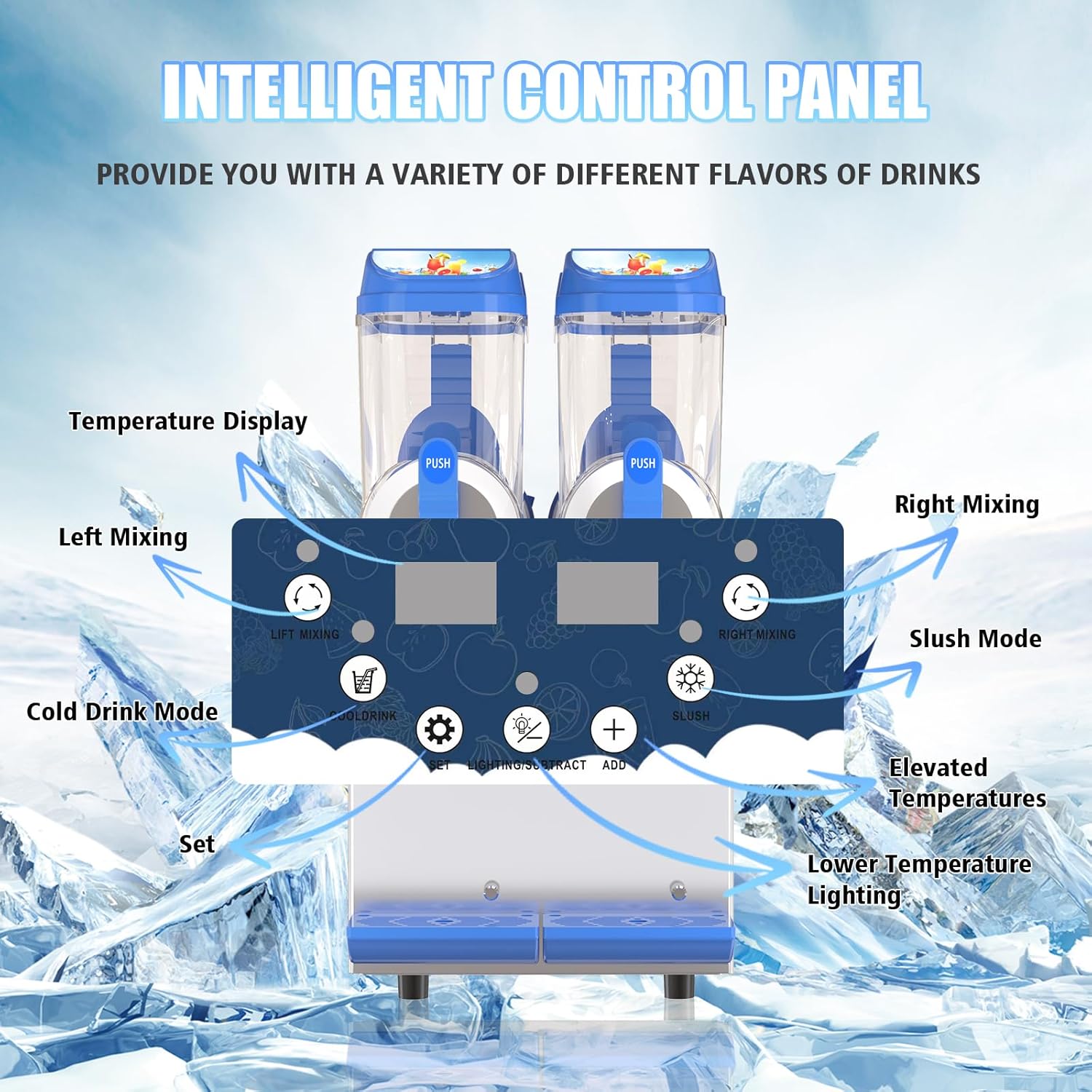 - 30L Slushy Machine: 15L*2 Tank (7.92 gal) in capacity. can produce 60 cups of smoothie drinks. 364W rated wattage and professional Embraco compressor make smoothie machine operation more stable.