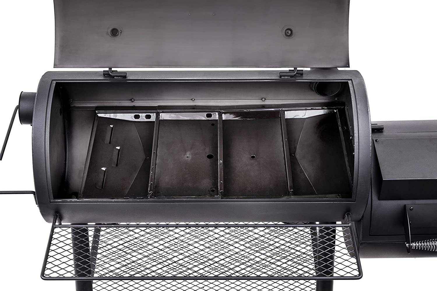 - Reverse-flow smoker employs a Series of 4 baffles to guide heat and smoke through the main chamber delivering an even and delicious result