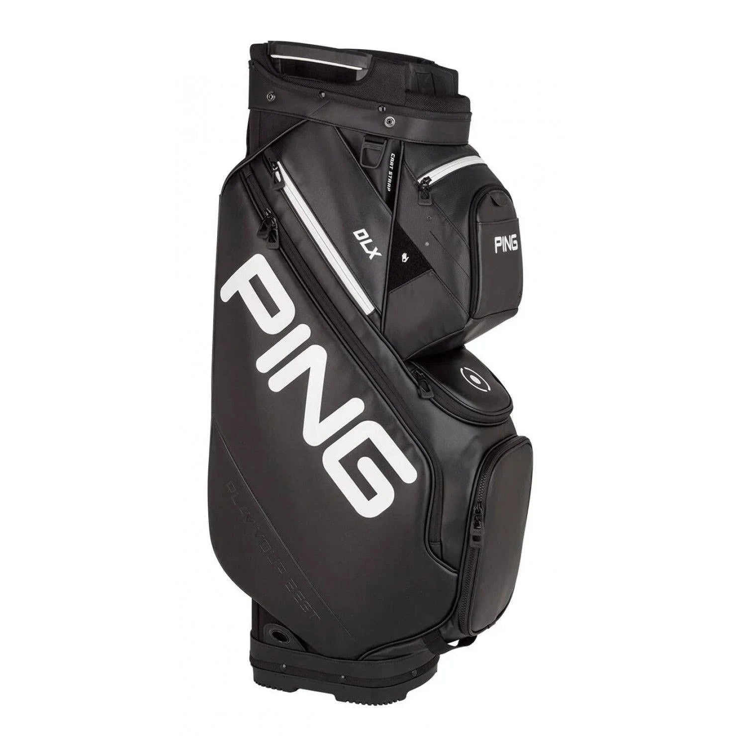 When you have more to store. the robust. fully featured DLX cart bag delivers with 15 pockets. most of any PING bag. Features a 15-way top. too. and two deployable shoe pouches that come in handy for your pre-and post-round shoe change. The high-durability needle-texture vinyl exterior cleans easily and is built for the long haul. Keep your clubs evenly dispersed so they're easy to find and replace in this 15-way top with a spacious putter well. This convenient strap pass-thru keeps your bag secured to a cart without blocking access to any of the 15 pockets. Magnetic drop down ball pocket. Magnetic in-play range-finder pocket. Where do you put your street shoes during a round and your shoes after a round? In the two deployable shoe pouches tucked neatly on the underside of the bag.