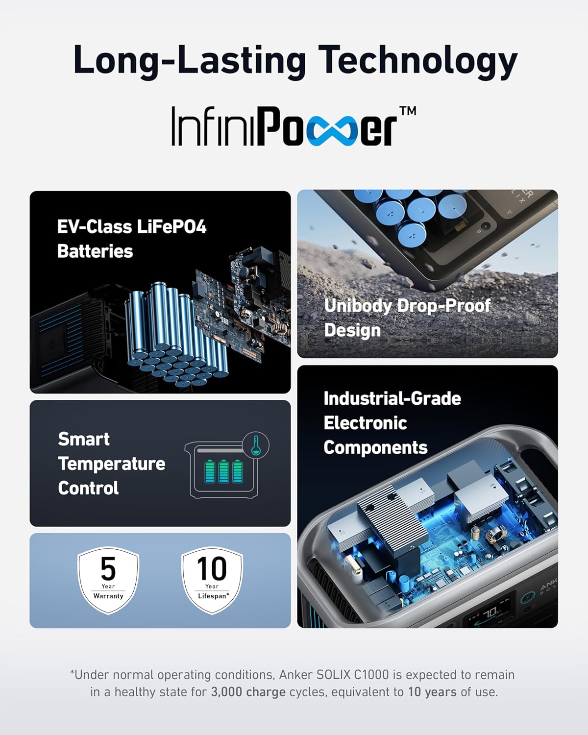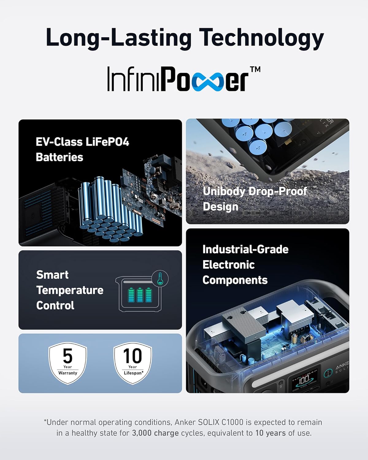 - 10-Year Lifespan. 3.000 Battery Cycles: Anker SOLIX C1000 is built to last with over 3.000 battery cycles. So power up. day after day. for 10 years.